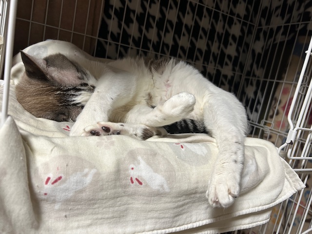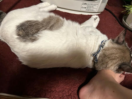おかぁたんの足に頭乗せて寝ちゃってます