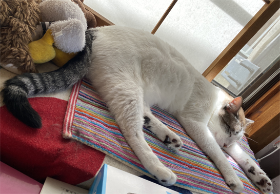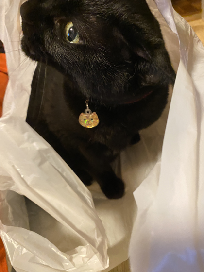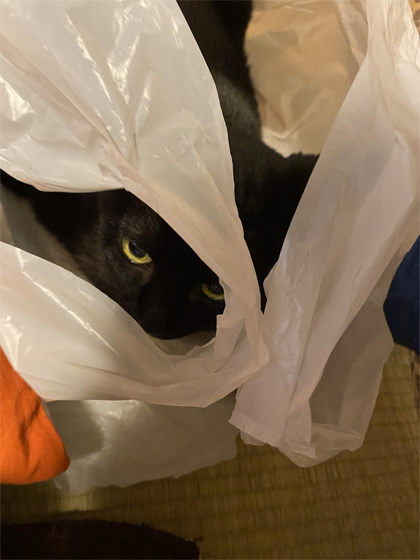 くぃ♪っとお顔あげて、レジ袋ペロペロ。