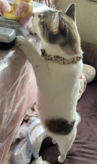 お布団のすぐ横の机の上に興味津々。