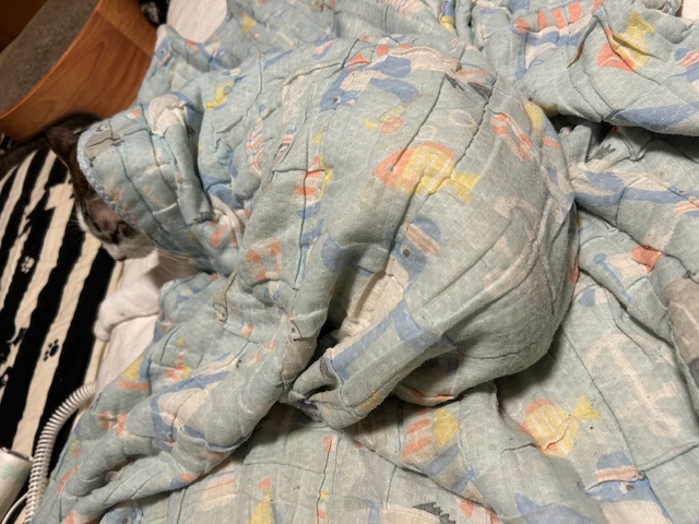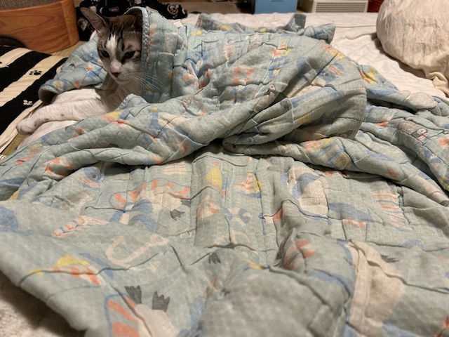 あったか羽毛布団の上に乗りながら、