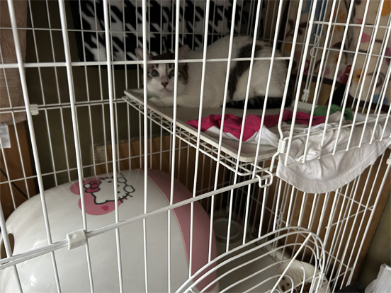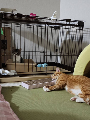 その間、ケージの隅っこに隠れてるふりで逃げ込んだ、にこ(笑)