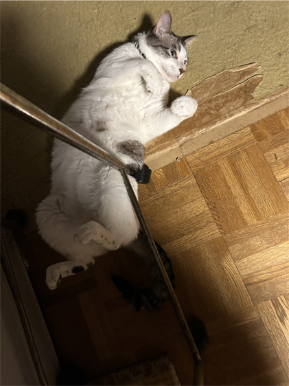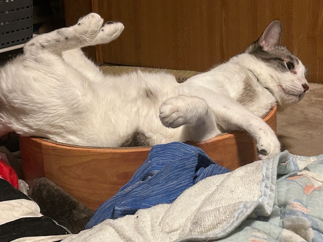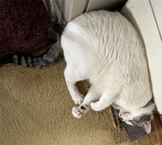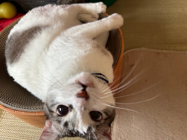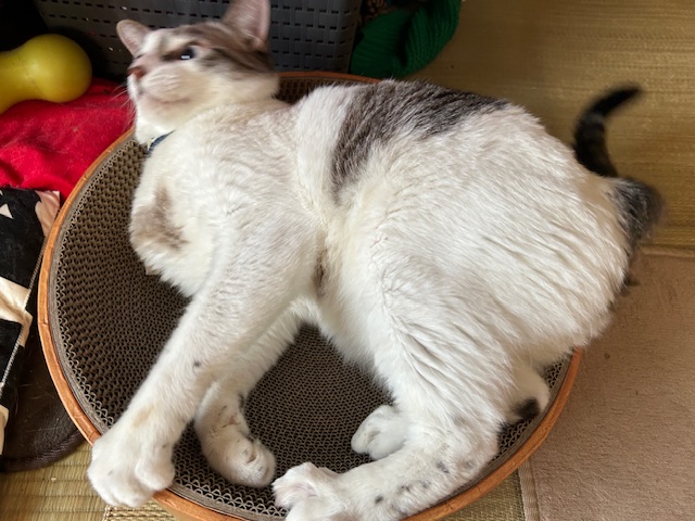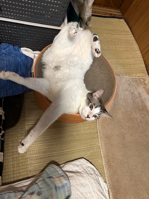爪とぎの上に寝っ転がって、マタタビの棒で