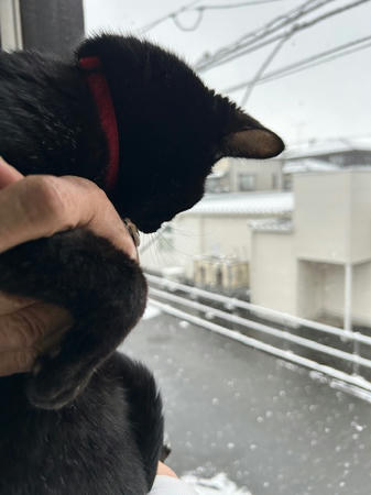 こちらも、おとぅたん抱っこで、雪を見る、にこ。