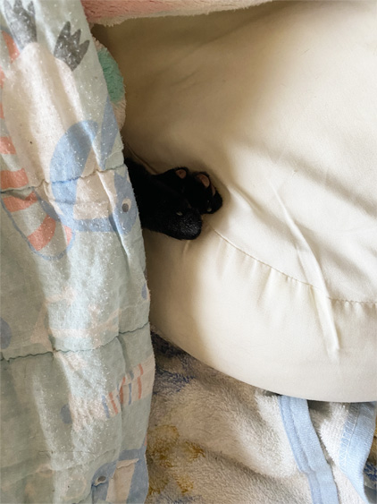 おかぁたんの足にピタ。(写真左側がおかぁたんの足。)