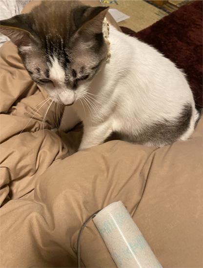 寒いから、お布団の上からなかなか動いてくれないの・・・。