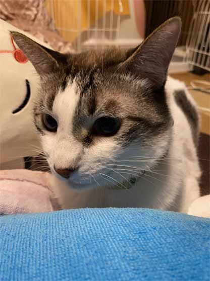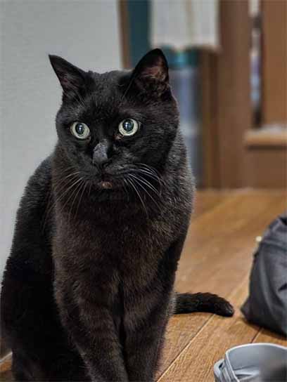 ご飯の前で、じっと耳をこっちむけて待つ、にこ。