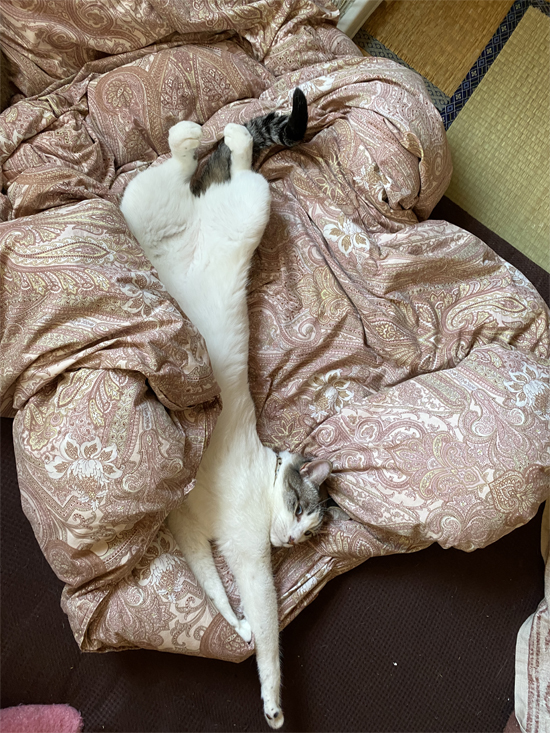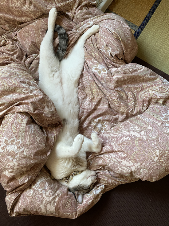 羽根布団、直はもう暑いらしく、タオルケットを